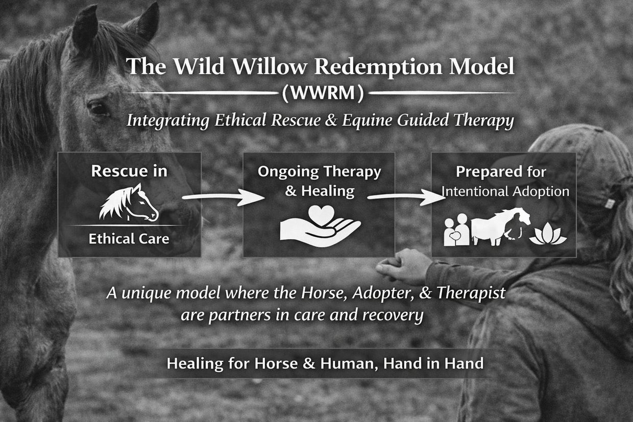 The Wild Willow Redemption Model is an integrated rescue and adoption approach designed to support the shared recovery of both horse and human. WWRM intentionally bridges ethical horse rescue with the option for equine guided therapeutic work, recognizing that healing unfolds best through relationship, consistency, and time.